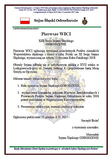 Ustawa Konstytucyjna z 15 lipca 1920 roku zawierająca statut organiczny Województwa Śląskiego (Dziennik Ustaw Nr 73, Poz. 497). Reaktywacja Sejm Śląski 1/5/2016//KOŃCZYCE MAŁE/6 maja A.D. 2016